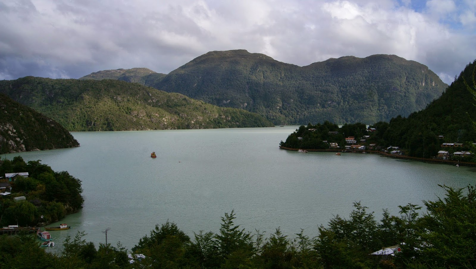 When we started to approach Tortel, we drove through landscapes with impressive mountain ranges, lots of rivers and streams, and a very humid climate. Tortel lies by the calm water of a fjord-like basin, on the side of steep and green mountain sides. It is entirely navigated on boardwalks built around the village, thus inaccessible to vehicles. The town is very quiet, and renders an unmistakable end-of-the-world atmosphere.